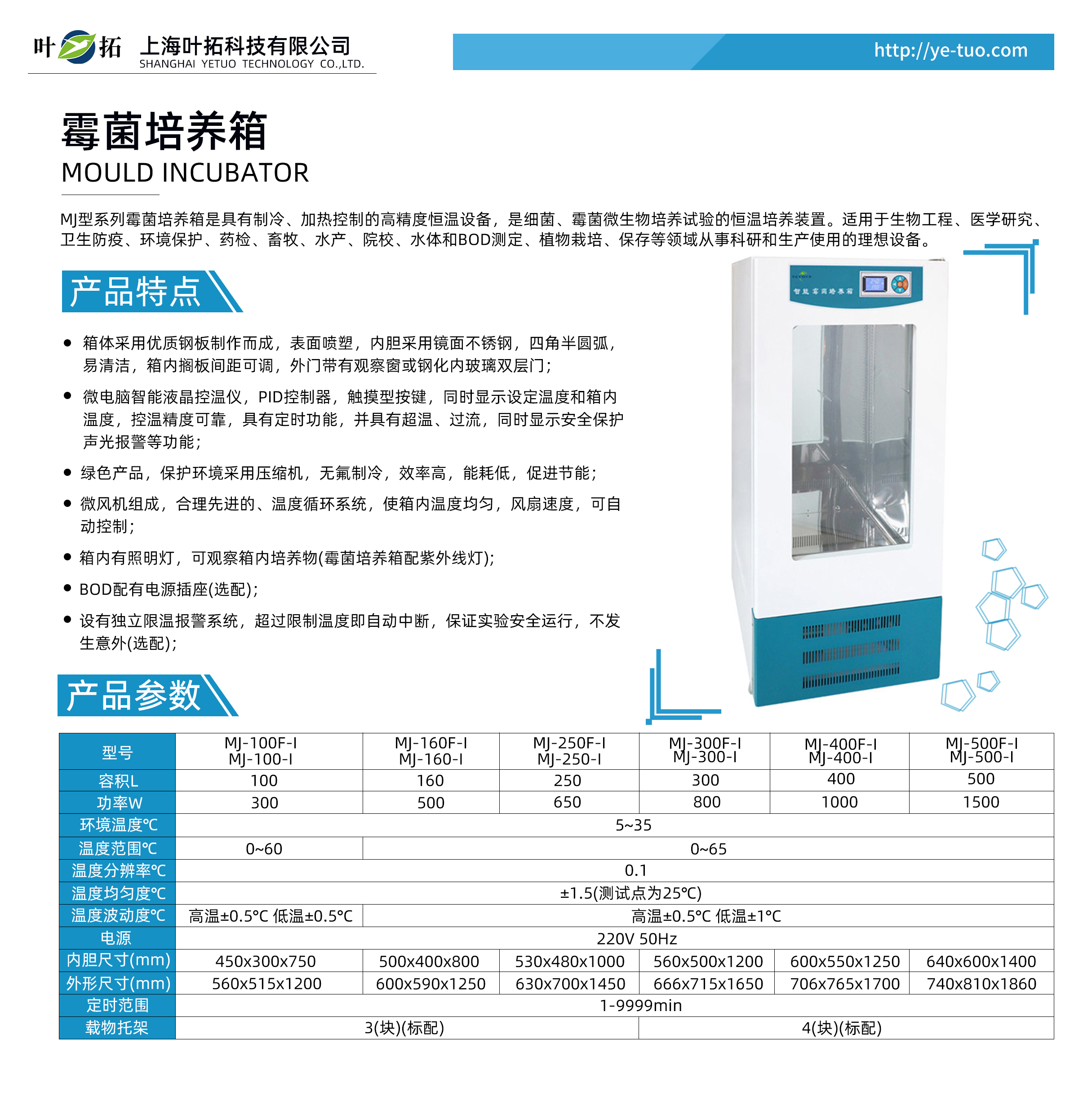 產品用途:MJ型系列霉菌培養箱是具有制冷、加熱控制的高精度恒溫設備,是細菌、霉菌微生物培養試驗的恒溫培養裝置。適用于生物工程、醫學研究、衛生防疫、環境保護、藥檢、畜牧、水產、院校、水體和BOD測定、植物栽培、保存等領域從事科研和生產使用的理想設備。葉拓 MJ系列 霉菌培養箱產品特點●箱體采用優質鋼板制作而成,表面噴塑,內膽采用鏡面不銹鋼,四角半圓弧,易清潔,箱內擱板間距可調,外門帶有觀察窗或鋼化內玻璃雙層門;